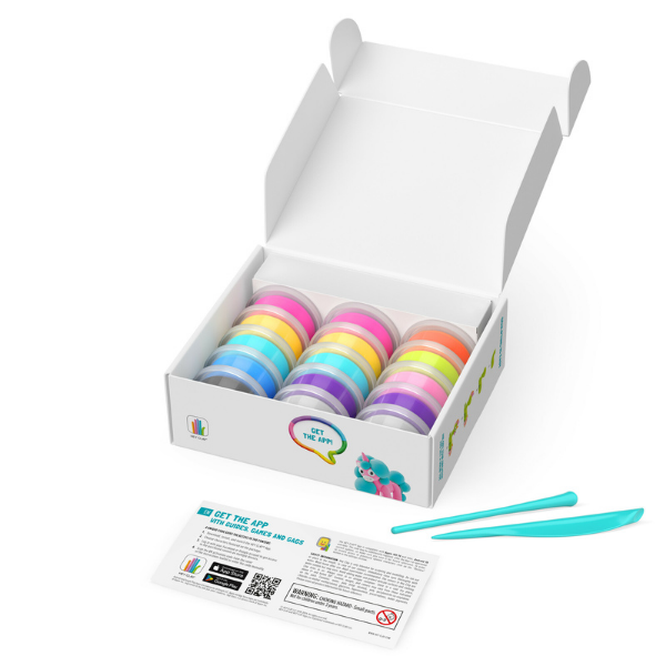 Rainbow Unicorns. Colourful modelling air-dry clay, 15 cans with fun interactive app for kids aged 3+ years.